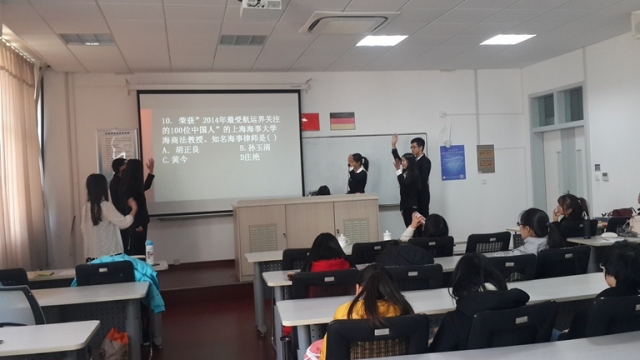 首先,活动第一环节为名师指路,章强老师向在场的同学简单介绍当前国内的主要航运公司以及其子公司在全国的分布情况。接下来的第二环节便是比赛正式环节。比赛分为三个阶段,依次为自我介绍,必答题以及抢答题。各位选手根据自己的序号逐一上台介绍自己和回答问题。在抢答题阶段,选手们更是使出浑身解数,争先恐后的举手,积极踊跃地回答,将本次比赛推向了高潮。