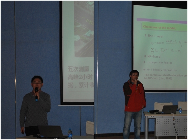 交通运输学院的院长葛颖恩教授首先就主题做简短介绍。研讨会分上半场和下半场,历时4个半小时。上半场由交通运输学院郑士源教授主持,来自上海交通大学船舶与海洋工程学院的谢驰教授、我校科学研究院的何红第副教授第、李锋老师做研究报告,下半场由科学研究院的何红弟副教授主持,华中科技大学的谭志佳副教授、交通运输学院的张欣副教授和郑士源教授做研究报告。他们的报告内容涉及新能源车辆使用下的交通行为与网络均衡、车辆排放物的交通建模、连续型泊位分配与龙门吊联合作业优化、内河港口选址、定价与规模决策、国际航运市场的风险分析、港口的多层级管制等主题。会场中间穿插提问和讨论环节,气氛热烈,透出浓浓的学术气氛。